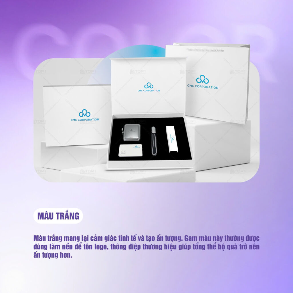 Màu trắng mang lại cảm giác gọn gàng, sạch sẽ và dễ tạo thiện cảm. Trong thiết kế quà tặng doanh nghiệp, trắng thường đóng vai trò là màu nền để làm nổi bật logo, thông điệp hoặc các màu chủ đạo khác.