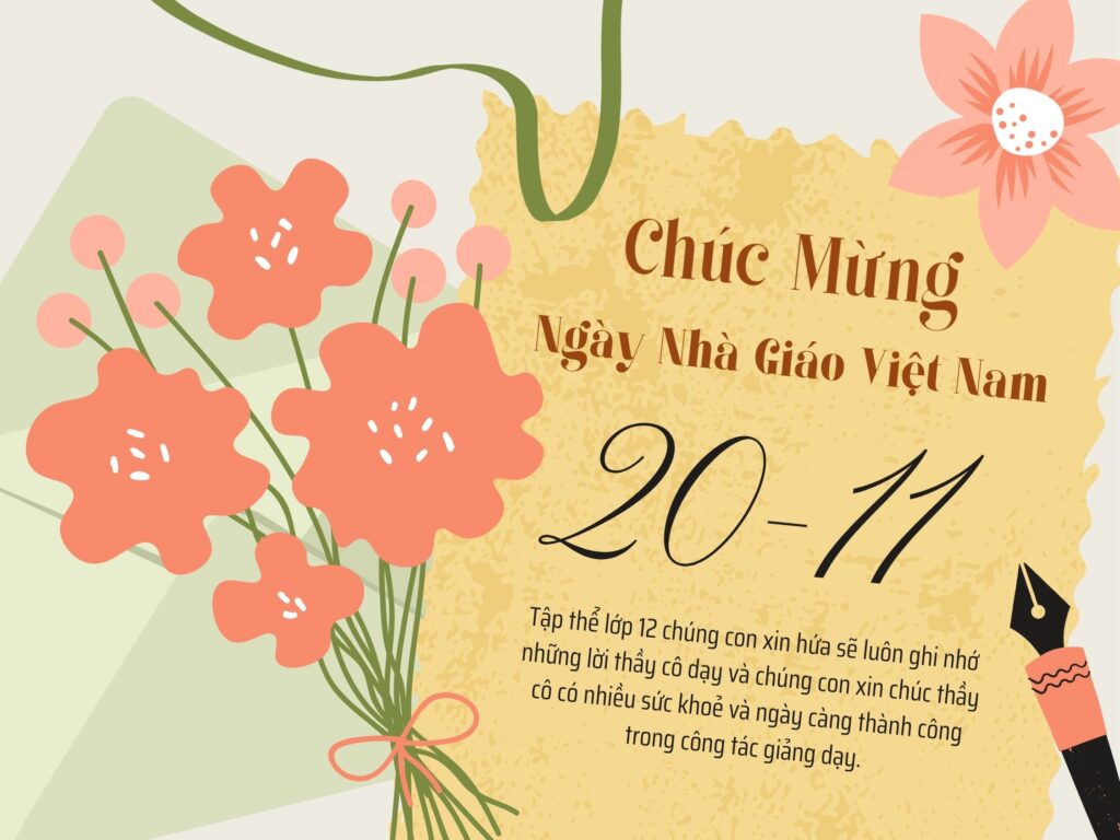 Nhân ngày Nhà giáo Việt Nam, em xin gửi đến thầy cô lời chúc sức khỏe, niềm vui và hạnh phúc. Cảm ơn thầy cô đã tận tâm dạy dỗ, truyền cảm hứng cho em trên hành trình trưởng thành.