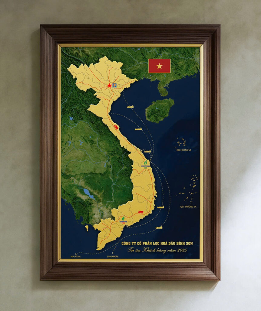 Bộ quà đầu tiên là bức tranh bản đồ Việt Nam được Quatangcongnghe.vn thiết kế riêng cho BSR với hình ảnh đất nước sau sát nhập 34 tỉnh thành. Từng đường viền, từng mảng màu thể hiện rõ dấu chân của BSR và Petrovietnam – nơi những công trình dầu khí trải dài từ Bắc chí Nam, biểu trưng cho hành trình không ngừng mở rộng và kết nối.