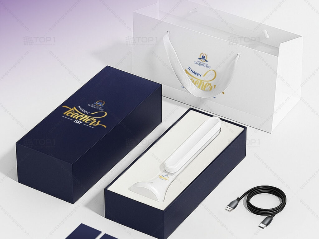 Set quà tặng tri ân thầy cô nhân ngày Nhà giáo Việt Nam 20/11 là chiếc Đèn Led Để Bàn Đa Năng Thông Minh Remax được thiết kếin logo trường học lên túi hộp và sản phẩm.