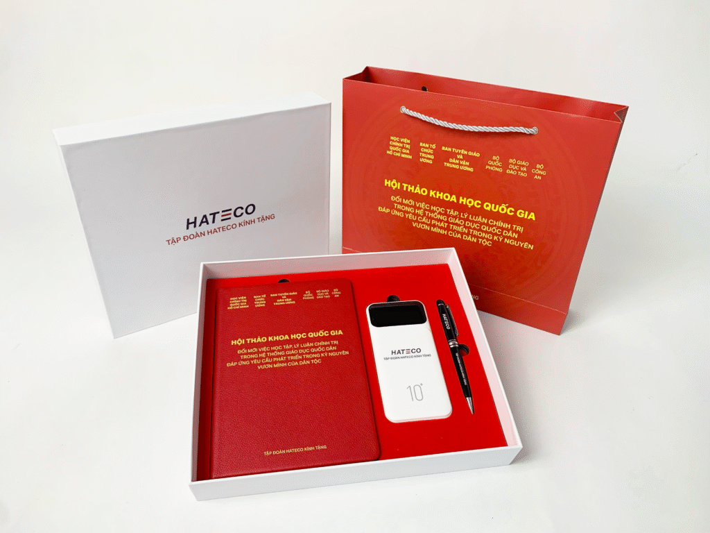 Bộ quà tặng công nghệ cao cấp được thiết kế riêng cho sự kiện Đại hội Đại biểu, thể hiện sự trang trọng, hiện đại và tinh tế, các sản phẩm bao gồm: Sổ tay da in logo, bút ký khắc tên, pin sạc dự phòng Remax.