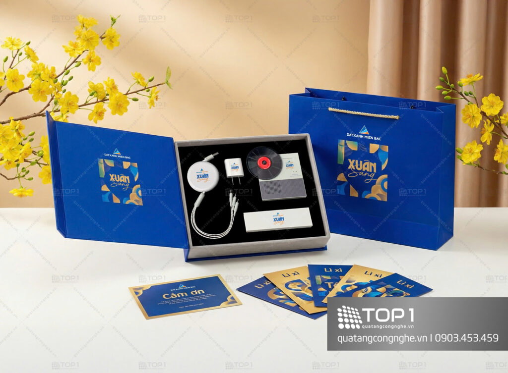 Set quà Tết cao cấp QT10 kết hợp giữa sản phẩm công nghệ hiện đại và thiết kế hộp sang trọng, tạo nên món quà tri ân đẳng cấp dành cho doanh nghiệp trong dịp năm mới.